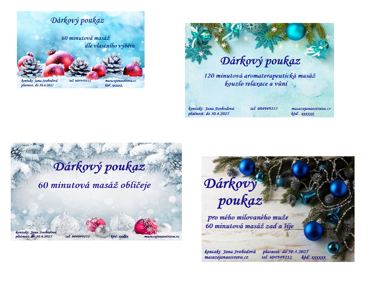 Udělejte radost svým blízkým dárkovým poukazem na masáž. Poukazy lze zakoupit na všechny masáže dle nabídky. Lze také různě kombinovat.